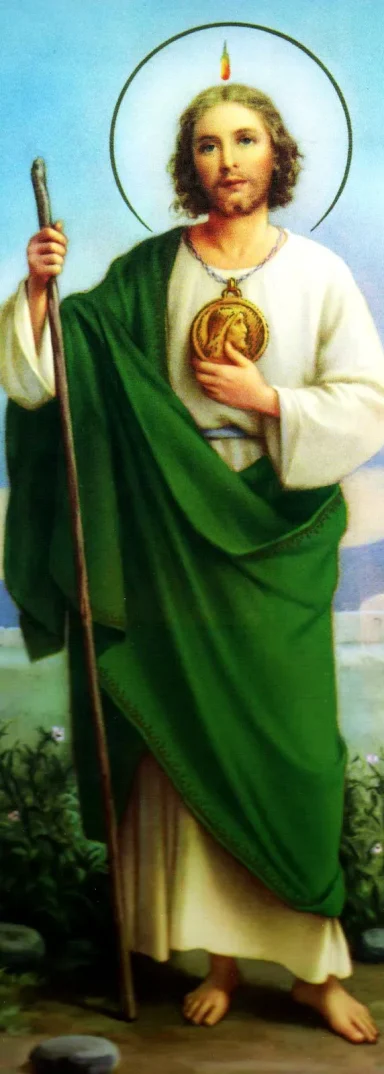 Saint Jude est parfois appelé Jude Thaddée - ce dernier nom signifiant "Courageux" ou "Coeur Ardent". Selon la Tradition, il serait parent de Notre Seigneur par sa famille étendue.